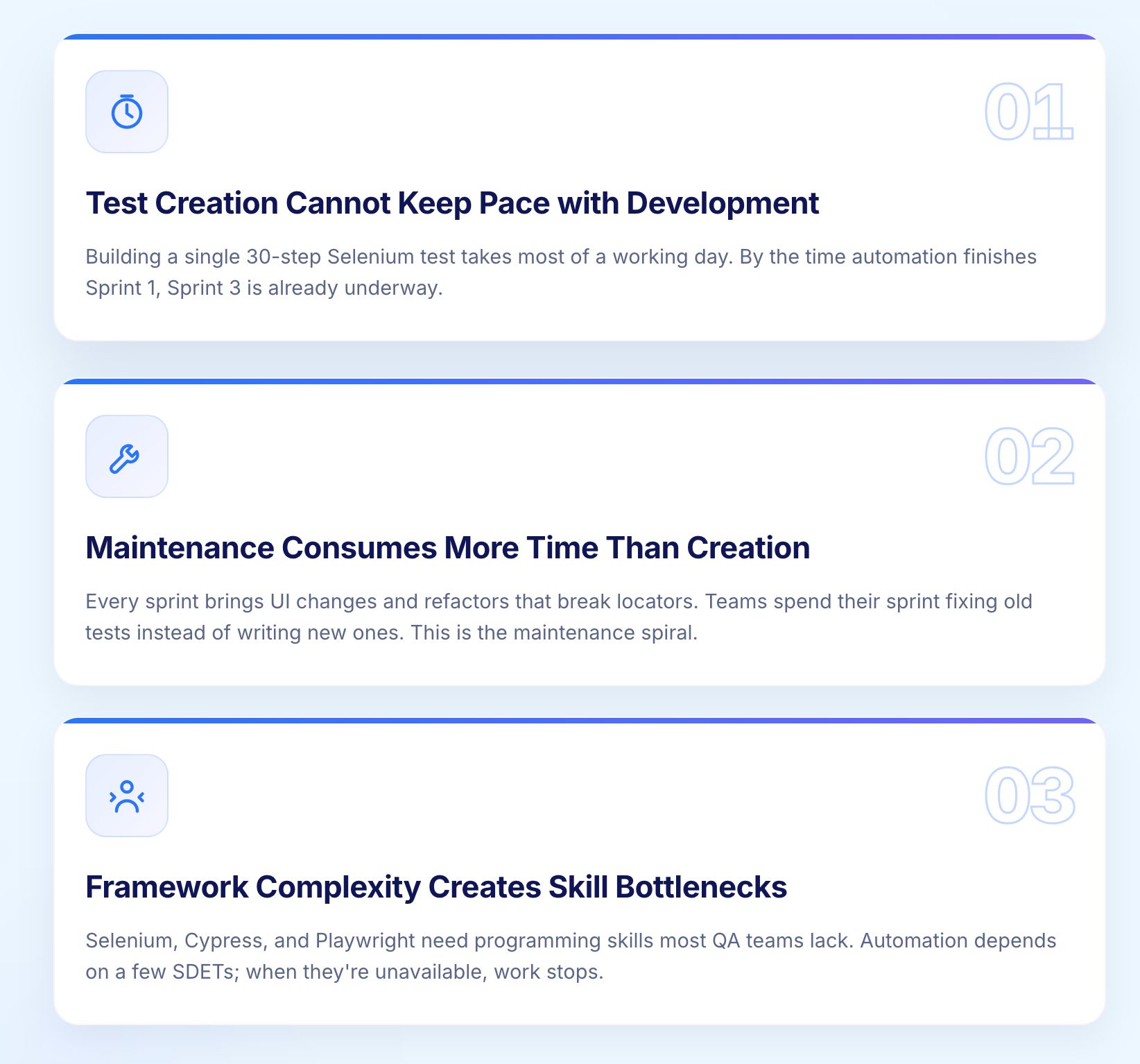 Selenium, Cypress, and Playwright require programming skills that many QA professionals do not have. This creates a dependency on a small number of SDETs (Software Development Engineers in Test) who become bottlenecks. When the SDET is sick, on vacation, or overloaded, automation stops.