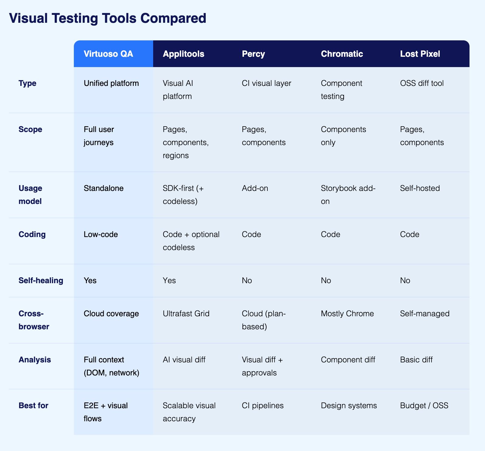 If a mature Selenium, Cypress, or Playwright suite is already running, Percy or Applitools integrate with what exists without requiring a rebuild. If starting from scratch or replacing an existing framework, a unified platform like Virtuoso QA that handles functional and visual testing together is worth evaluating before committing to two separate tools.