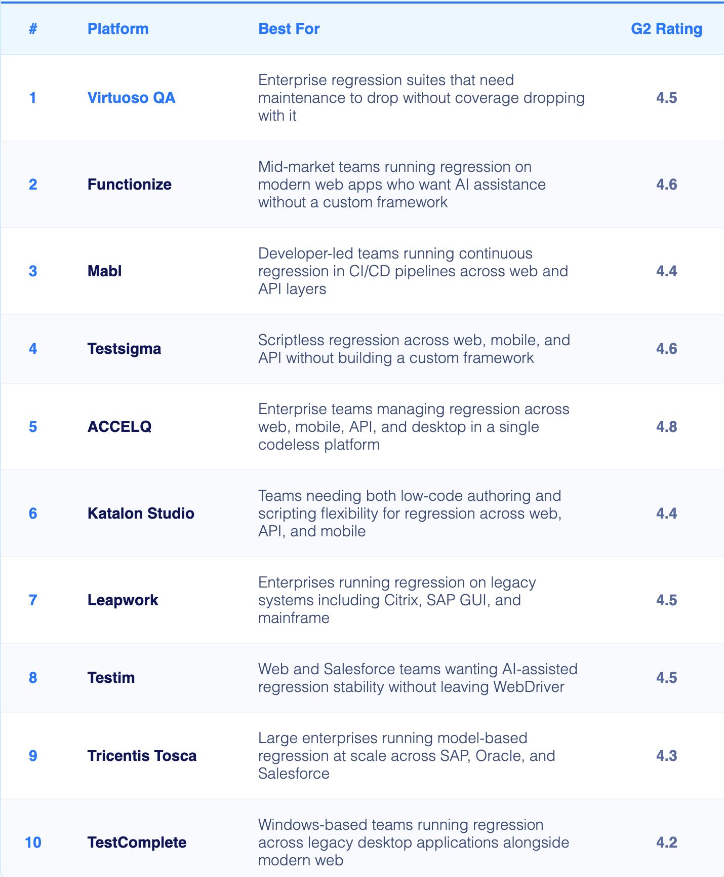 Compare the best regression testing tools in 2026, from AI-native Virtuoso QA to Selenium and Tricentis Tosca. Find the right fit for your team.