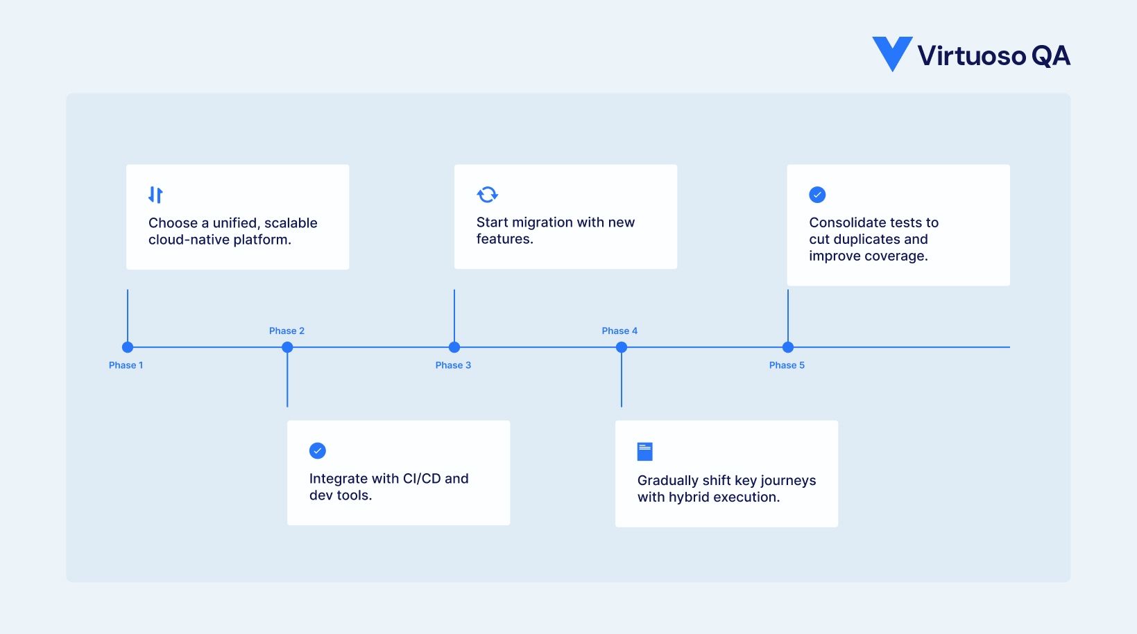 Migration to unified testing requires careful planning to maintain testing continuity while transforming processes. The recommended approach begins with new feature testing, where unified testing can demonstrate value without disrupting existing test suites. As teams gain experience and confidence, high-value user journeys can be migrated to unified testing. Finally, remaining tests can be progressively migrated or retired based on value analysis.